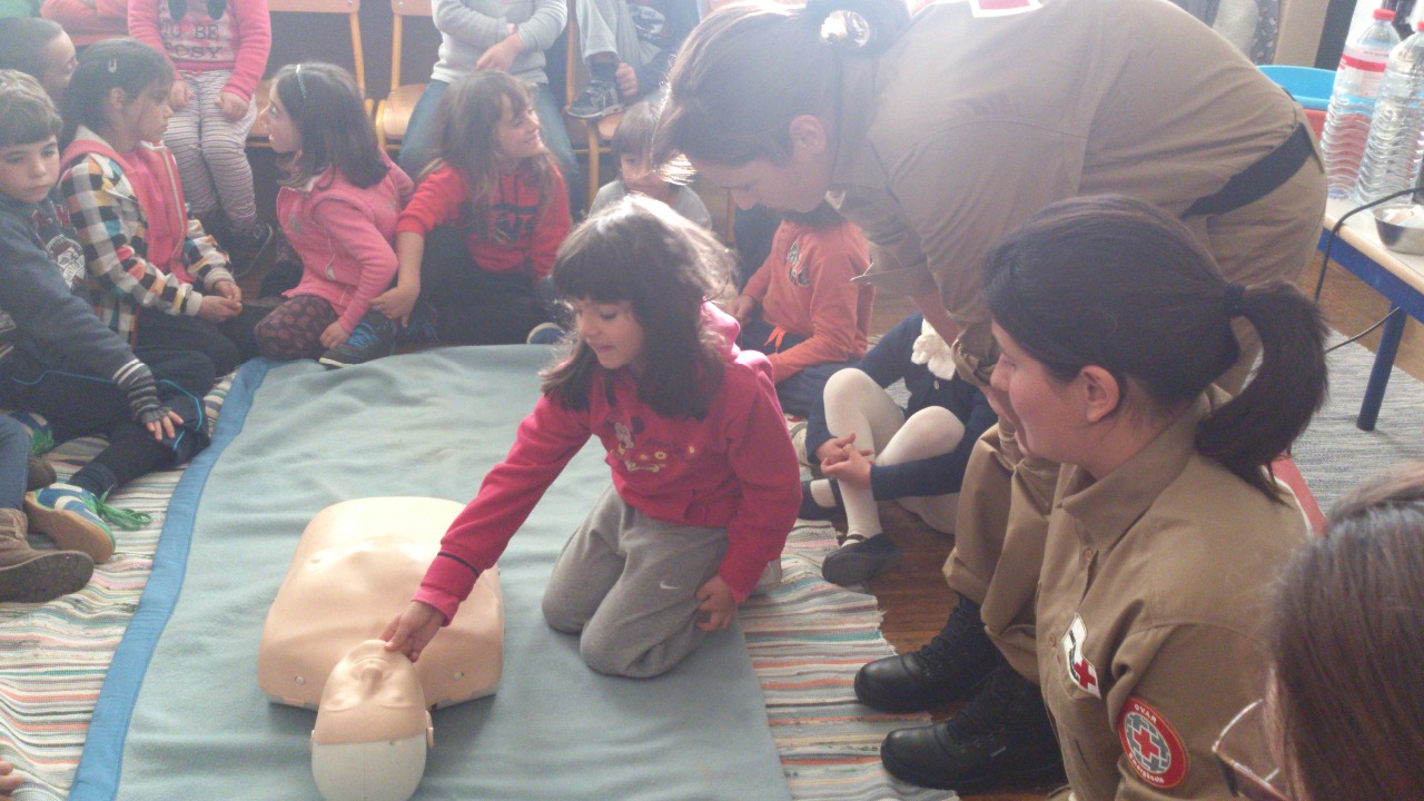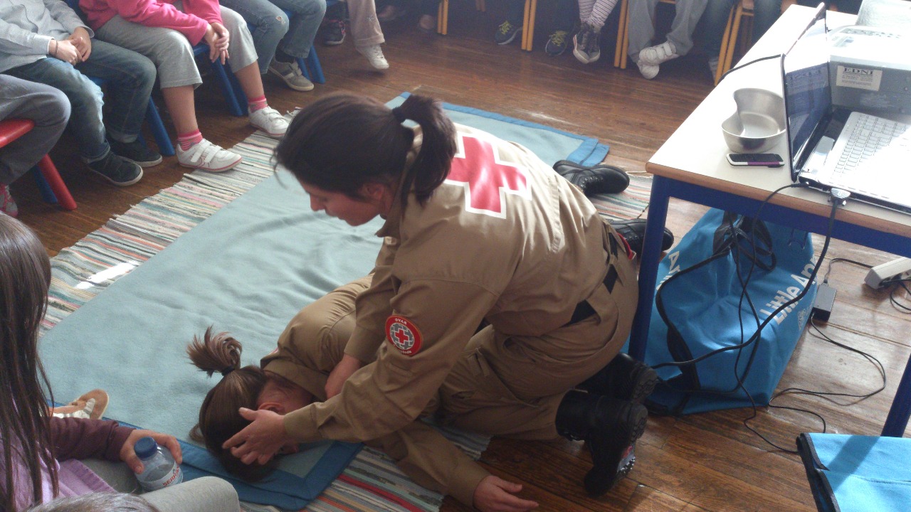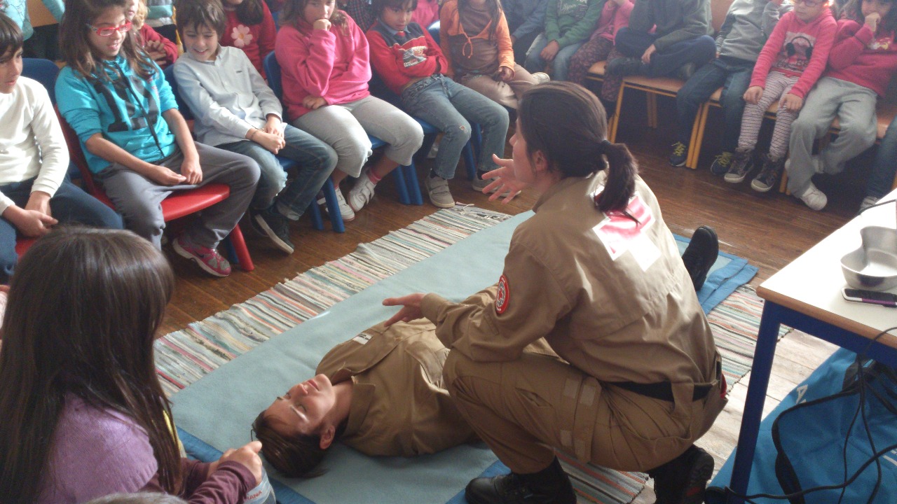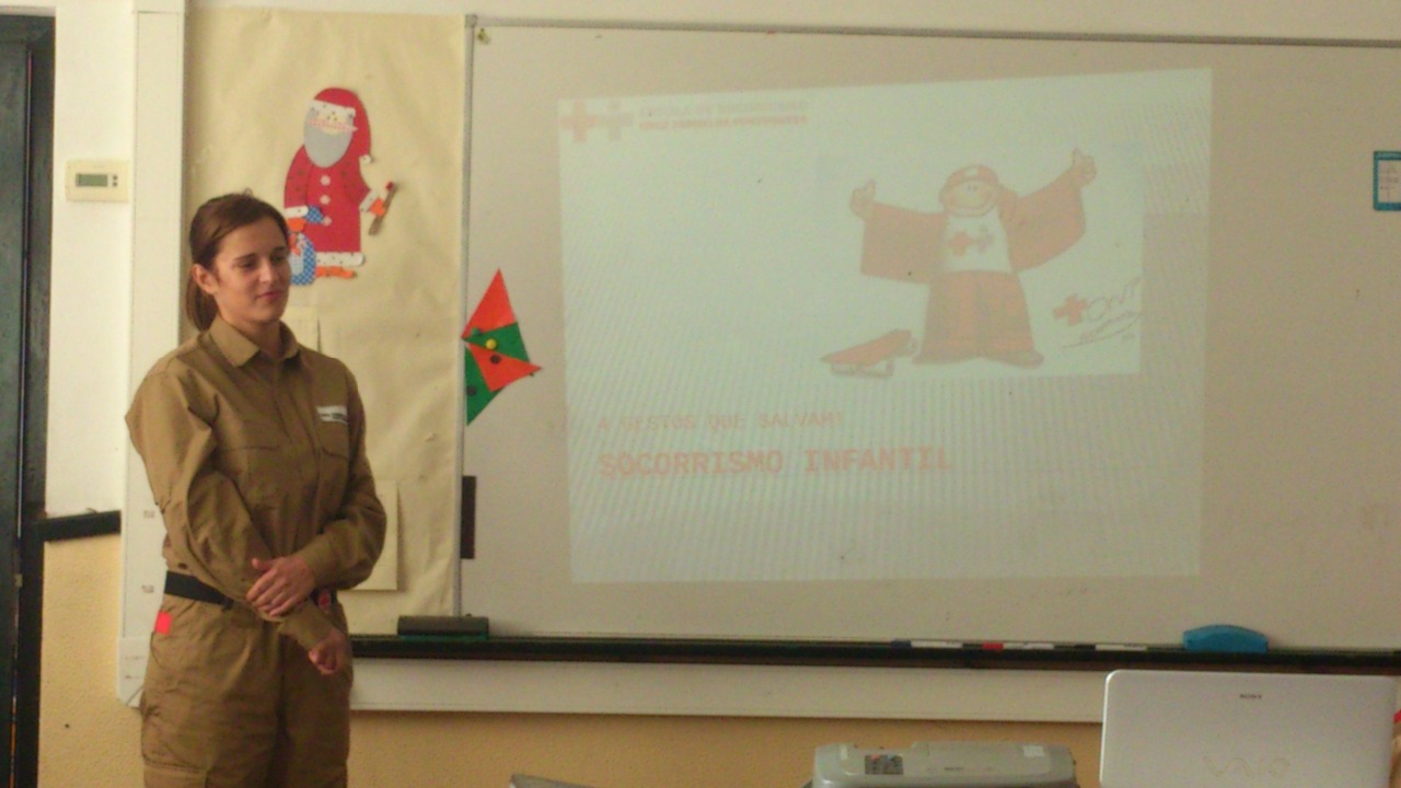 Uns infermeiros da Cruz Vermelha foram à nossa escola ensinar-nos como devemos fazer se alguém se magoar, se se queimar ou se tiver algum tipo de problema e estiver desmaiado.