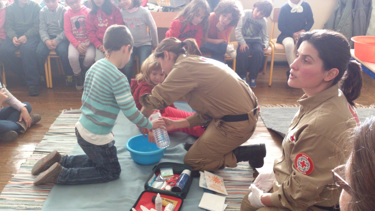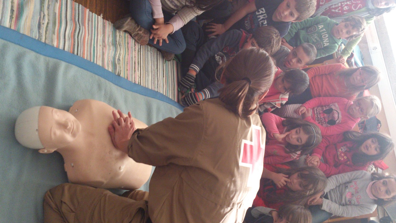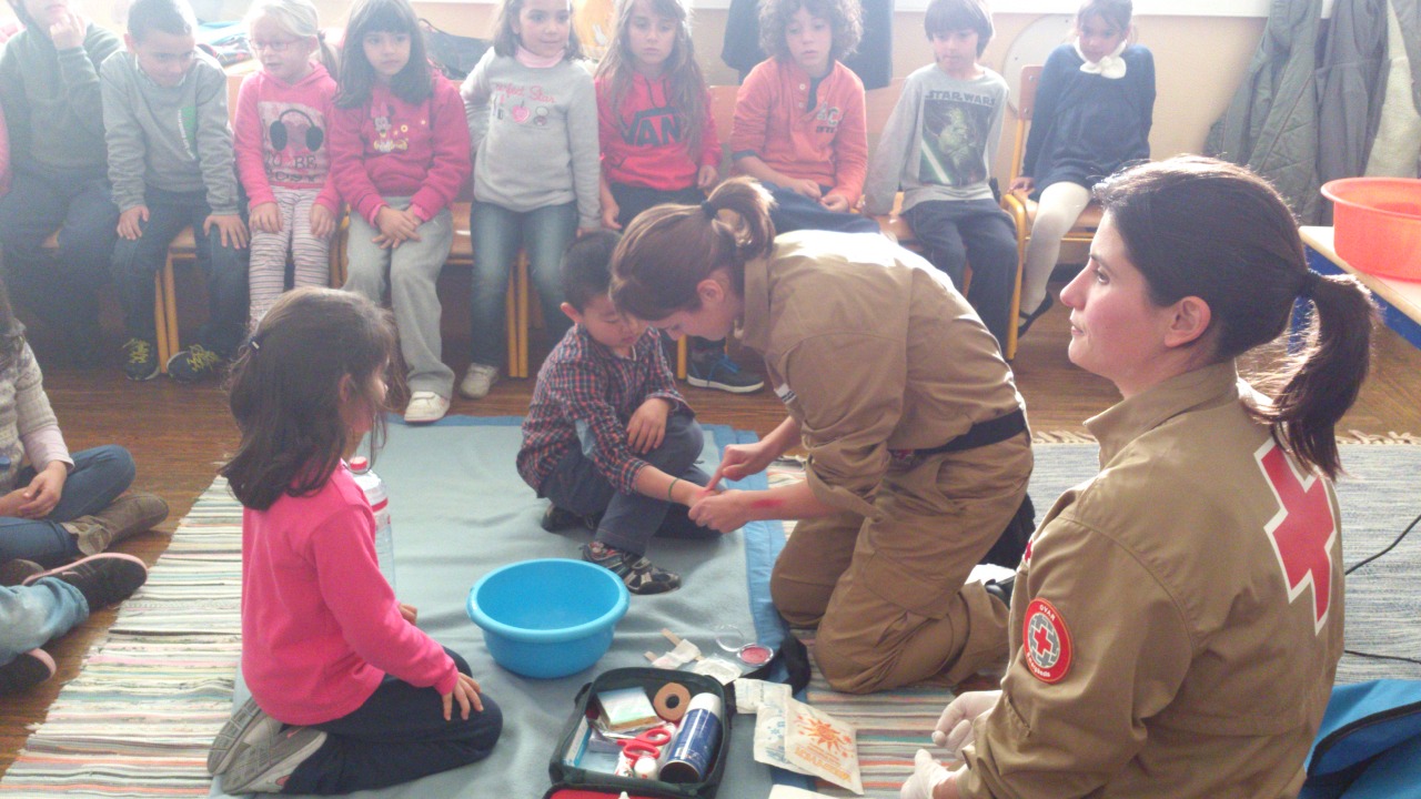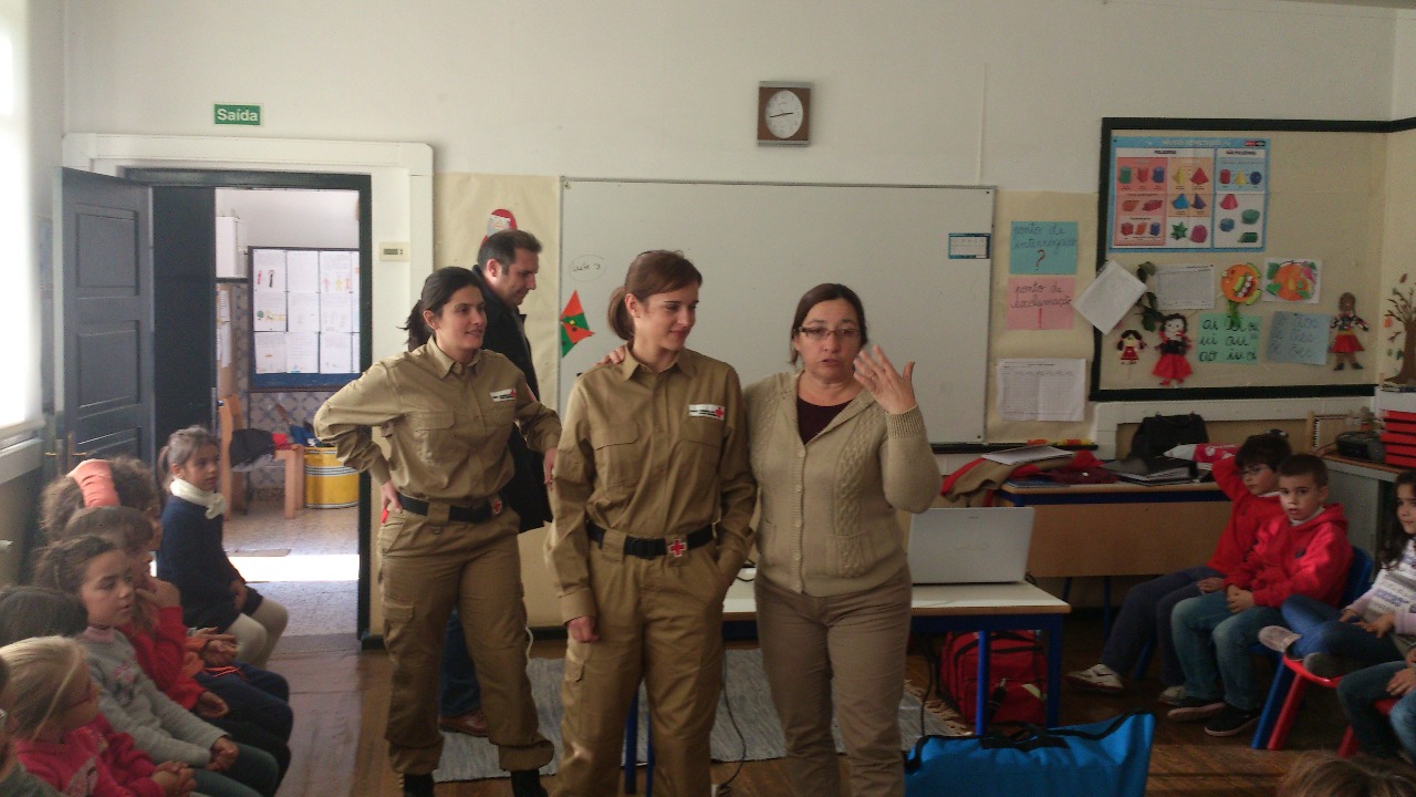 Uns infermeiros da Cruz Vermelha foram à nossa escola ensinar-nos como devemos fazer se alguém se magoar, se se queimar ou se tiver algum tipo de problema e estiver desmaiado.